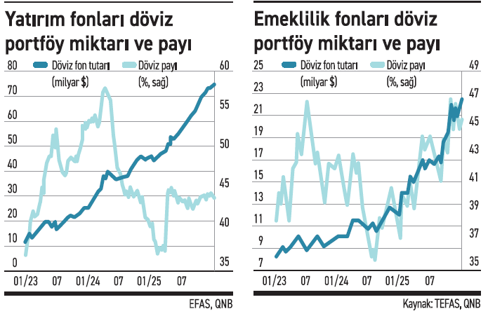 Kur korumalı mevduatın bitirilmesi, döviz mevduata getirinin düşük olması yatırımcıları döviz getirisi sağlayan fonlara yöneltti. Bu yıl boyunca yatırım fonlarında dolarizasyon eğilimi yükseliş gösterirken son dönemde menkul kıymet yatırım fonlarının toplam yatırımları içinde döviz cinsi varlıkların payının yataya yakın seyrettiği gözlenirken emeklilik fonlarının döviz payı ise artış kaydetti. QNB ekonomistleri bu artışın daha çok altın fiyatları ile ilgili olduğunu ifade etti.