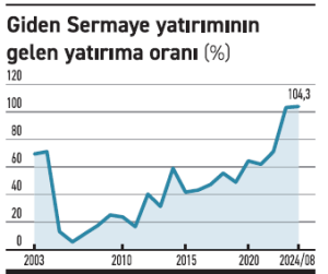 Gayrimenkul ve diğer sermaye (ana şirketlerin yabancı ülkedeki kendi şirketine verdiği borç-kredi) dışarıda bırakılarak, tasfiye edilen yatırımlar da düşülerek net sermayeye bakıldığında ise giden yatırımın son dönemde gelen yatırımdan daha fazla olduğu görüldü. İstatistik veri olan 1991 yılından bu yana ilk kez 2023 ve 2024’te giden yatırım, gelen yatırımdan daha yüksek hale geldi. 2023’ün tamamında gelen her 100 dolarlık “sermaye” nitelikli net yabancı doğrudan yatırıma karşılık, Türkiye’den 103,61 dolar yurt dışına yatırım gitti. 2024 Ocak-Ağustos döneminde ise gelen her 100 dolarlık “sermaye” nitelikli yatırıma karşılık, 104,3 dolar yurt dışına yatırım yapıldı.