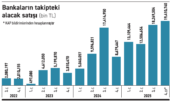 Sıkı para politikası, yüksek faizler ve gerileyen alım gücü hanehalklarının borç ödemelerini de etkiledi. Özellikle bireysel tarafta ihtiyaç kredi ve kredi kartlarında tahsili gecikmiş alacaklar bu yıl oldukça yüksek artış gösterdi. Buna paralel bankacılık ve diğer finans kurumları da bilançolarından bu alacakları temizlemek için tahsili gecikmiş alacak satışını hızlandırdı. EKONOMİ’nin Kamuyu Aydınlatma Platformu’na yapılan açıklamalardan yaptığı hesaplamalara göre yılın son çeyreğinde bankalar ağırlıklı olmak üzere finans kurumlarının tahsili gecikmiş alacak satışı 19 milyar 410,7 milyon liraya yükseldi. 2025 yılının tamamındaki toplam satış geçen yılın yüzde 55,4 üzerinde 63 milyar 296,3 milyon lira üzerinde gerçekleşti ve hem çeyrek hem de yıllık olarak tarihi en yüksek tahsili gecikmiş alacak satışı yapıldı.