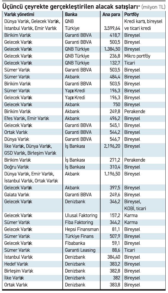 Tahsili gecikmiş alacak bakiyesi ve tahsili gecikmiş alacak oranındaki bu yükselişler banka ve finans kurumlarında bilançoları rahatlatmak için tahsili gecikmiş alacakları varlık yönetim şirketlerine satışlarını yoğunlaştırdı. KAP verilerine göre dördüncü çeyrekte 19 milyar 410,7 milyon liralık tahsili gecikmiş alacak satışı yapıldı. Bankaların yüklü satışları dikkat çekerken tahsili gecikmiş alacaklarda bireysel portföylerin temizlenmesi de dikkat çekti. KAP bildirimlerine göre bankaların yanı sıra leasing, faktoring ve finansman kurumları da dördüncü çeyrekte tahsili gecikmiş alacak satışı yaptı. Bu tarz kurumların dördüncü çeyrekteki takipteki alacak satışı 671.1 milyon lira gerçekleşti.