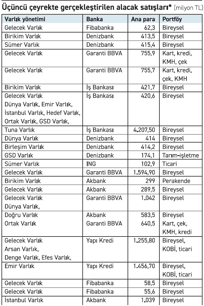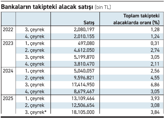 Takipteki alacak bakiyelerinde bu hızlı yükseliş bankacılık sektöründe takipteki alacak satışlarını da arttırdı. 2023 toplamında sadece 14 milyar 119,5 milyon liralık takipteki alacak portföyü ana para satışı yapan bankacılık sektörü 2024 yılında 40 milyar 731,3 milyon liralık takipteki alacak ana para satışı gerçekleştirdi. 2025 yılının ilk dokuz ayında ise 2024 yılının tamamı geride kaldı ve 43 milyar 721,1 milyar lirayla 44 milyar liraya dayanan takipteki alacak satışı yapılmış oldu. Geçen yılın ilk üç çeyreğinde 32 milyar 51 milyon liralık satış olurken bu yılın ilk üç çeyreğinde yüzde 36,4 artış gözlendi. Geçen yılın üçüncü çeyreğinde de tüm yılın en güçlü satışı yapan bankacılık sektörü bu yıl da aynı performansı sergiledi. Geçen yıl üçüncü çeyrekte 17.4 milyar lirayı aşan takipteki alacak satışı yapan bankacılık sektörü bu yılın üçüncü çeyreğinde de 18 milyar lirayı aşan takipteki alacak portföyü satışı ile bir rekora imza attı.