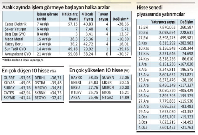 Halka arzların durması, borsada yıl sonunda yoğunlaşan satışlar, risksiz getiride yükselen avantaj borsa yatırımcısının çıkışını hızlandırdı. 13 Aralık’ta tarihi zirvesine yükselen yatırımcı sayısı 16 işlem gününde 1 milyon 180 kişi azalarak 7.6 milyona indi. Aynı dönemde en çok düşen 5 hissenin 3’ü ise yeni halka arz hissesi oldu.