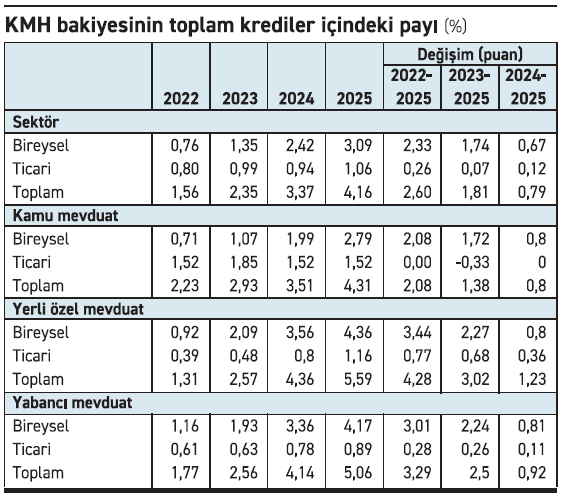 Bankacılık sektöründe böylece toplam bireysel ve ticari KMH bakiyesinin toplam krediler içindeki oranı yüzde 4,16 ile tarihi en yüksek seviyesine çıkarken, bireysel KMH’nin toplam kredilerdeki payı yüzde 3,09, ticari KMH’nin ise yüzde 1,06 olarak hesaplandı. Bireysel müşterilerde KMH kullanımı çok daha hızlı büyüdü ve toplam krediler içindeki payı da aynı derecede hızlı büyüme gösterdi.