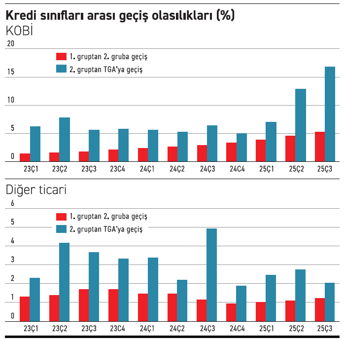 Merkez Bankası finansal istikrar raporu da ticari kredilere ilişkin öncü göstergelerin KOBİ kredileri için tahsili gecikmiş alacak geçiş oranlarında artışa işaret etti. Ticari kredilerin düşük seyreden kredi riskliliği alt gruplarda ayrışırken öncü bir gösterge olarak Merkez Bankası’nın takip ettiği kredi sınıfları arasında geçiş olasılıkları KOBİ kredilerinde tahsili gecikmiş alacağa geçişlerin son dönemde hızlı bir artış gösterdiğine işaret etti. Rapora göre KOBİ kredilerinde bu yılın ilk çeyreğinde yüzde 7’ye yakın seyreden 2. gruptan TGA’ya geçiş olasılığı ikinci çeyrekte yüzde 13'ü aşarken üçüncü çeyrekte yüzde 15'in üzerine çıktı. Bununla birlikte KOBİ segmentinde 1. grupta yer alan kredilerin, 2. gruba geçiş olasılığı yüzde 5,1’e yükseldi. Aynı dönemde büyük işletmelerin yer aldığı diğer ticari kredilerde birinci çeyrekte ikinci gruptan tahsili gecikmiş alacağa geçiş olasılığı yüzde 2'nin üzerindeyken, ikinci çeyrekte yüzde 3'e yaklaştı ama üçüncü çeyrekte yeniden yüzde 2'yey geriledi. Tarihsel olarak bakıldığında KOBİ kredilerinde yakın izleme grubu olan ikinci gruptan tahsili gecikmiş alacak sınıflandırmasına geçiş oranı en yüksek seviyesine bu yıl üçüncü çeyrekte çıktı. KOBİ kredilerinin takibe düşme olasılıklarının yanı sıra canlı kredilerden yakın izlemeye düşme olasılığında da hızlanma oldu.