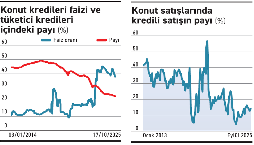 Konut kredilerinde büyüme başlaması toplam tüketici kredileri içinde konut kredilerinin payının da en düşük seviyelerinden yeniden artışa geçti. Toplam tüketici kredileri içinde konut kredilerinin payı 21 Ekim itibariyle yüzde 24,15’e yükseldi ve en düşük gördüğü seviye olan yüzde 24’ten hareketlenme başladı. Merkez Bankası verilerine göre de konut kredileri ağırlıklı ortalama akım verisi yüzde 37,91'e geriledi bu oran 2023 Eylül'den bu yana görülen en düşük seviyeye işaret ediyor.