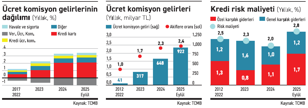 Kredi risk maliyetleri bu yıl eylül sonunda yüzde 2,8'e yükseldi. Geçen yılsonunda bu oran yüzde 2 seviyesindeydi. Özellikle özel karşılık giderlerindeki artış yükselişte etkili oldu, geçen yılsonunda yüzde 1,1 olan özel karşılık giderlerinin oranı bu yılın üçüncü çeyreği sonunda yüzde 1,7 orana yükseldi. Ücret komisyon gelirleri de 922 milyar liraya yükselerek geçen yılsonundaki 648 milyar liranın yüzde 42,3 üzerine çıktı. Ücret komisyon gelirlerinin aktiflere oranı ise geçen yılsonundaki yüzde 2,3'ten yüzde 2,4'e yükseldi. 2012-2022 ortalaması yüzde 1 olan oran 2023 sonunda yüzde 1,7'ye çıkmıştı. Ücret komisyon gelirlerinin dağılımında kredi kartlarının ağırlığı öne çıkıyor. Finansal istikrar raporuna göre toplam ücret komisyon gelirleri içinde kredi kartının payı yüzde 2,1 yani aktiflere oran yüzde 2,4'ün 2,1 puanı kredi kartlarından kaynaklandı. Yani gelirlerin yüzde 87,5'i kredi kartlarından geldi. Vergi ücret komisyonları ise 1 puanlık düşüş getirdi.