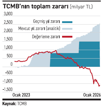 Bilanço içinde ise bankaların TL likidite açığının, TCMB’nin döviz alımlarının etkisiyle düşük seyretmesi ve zorunlu karşılıklar için yapılan faiz ödemeleri nedeniyle zarar yazılmaya devam edildi. Analitik bilançodaki “diğer kalemler” hesabındaki değişimden izlendiği kadarıyla, bilanço içinde görünen zarar 2025 yılında 1.1 trilyon TL artarak 2.6 trilyon TL’ye ulaştı. Bu zarar sıfırlanana kadar Hazine’ye herhangi bir kâr transferi önümüzdeki dönemde de yapılmayacak. Ancak değerleme hesabı ile birlikte değerlendirildiğinde, toplamda TCMB’nin geçen yıl yaklaşık 0.5 trilyon TL tutarında bir kâr gerçekleştirdiği görüldü.