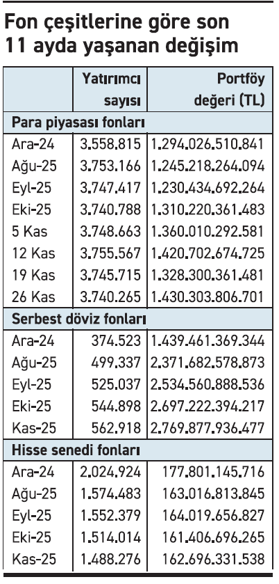 Yatırım fonları arasında en sert gerilemenin yaşandığı fon ise hisse senedi fonları oldu. Bu fonlar Borsa İstanbul’daki dalgalı seyir kadar sabit getirili yatırım enstrümanlarının cazip olması nedeniyle de yatırımcının eski dönemler kadar ilgisini çekmedi. TEFAS verilerine göre hisse senedi fonlarında 11 ayda 536 bin 648 yatırımcı çıkış yaptı. Bu fonların portföy büyüklüğü de 2024 sonuna göre 15 milyar 104,8 milyon azaldı. 26 Kasım itibariyle hisse senedi fonlarındaki yatırımcı sayısı 1 milyon 448 bin 276'ya indi, portföy büyüklüğü de 162 milyar 696,3 milyon liraya geriledi. Hisse senedi fonlarında bir ayda da 25 bin 738 yatırımcı çıkış yaşandı. Buna karşılık hisse senedi fonlarının portföy büyüklüğü 1 milyar 289,6 milyon lira arttı. Üç ay öncesine göre ise hisse fonlarında çıkış 86 bin 207 yatırımcı olarak hesaplandı portföy değerindeki gerileme ise 320.5 milyon lira oldu.