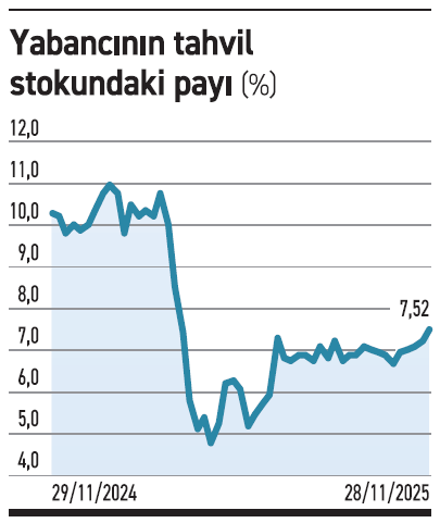 19 Mart gerginliğiyle birlikte yüzde 10,79 paya sahip olduğu devlet tahvillerinde sert satış yapan yabancının toplam tahvil stoku içindeki payı ilerleyen haftalarda yüzde 4,84'e kadar geriledi. Yaz boyunca dalgalı bir seyir izleyen yabancının tahvil ilgisi son 5 haftadır ise kesintisiz devam ediyor.