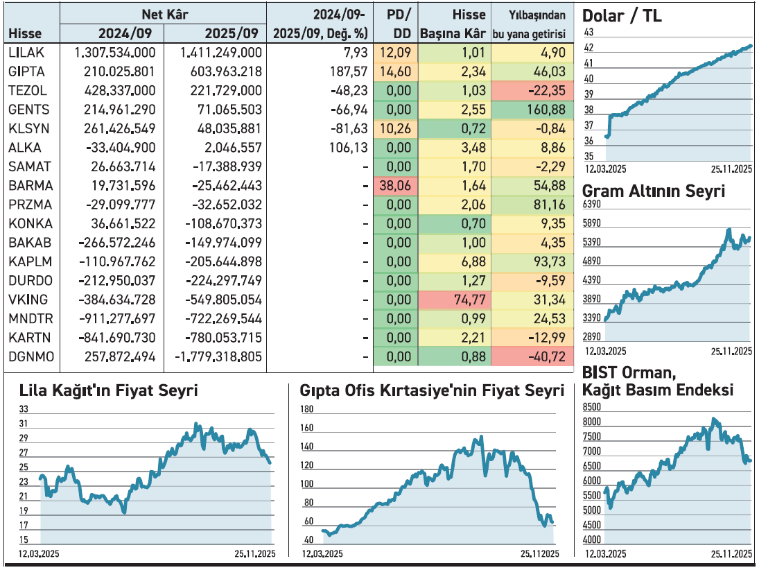 Mayıs 2024’te borsaya gelen Lila Kağıt, dokuz aylık dönemde 1,4 milyar TL ile sektörde en yüksek kârı açıkladı. Satışlarını %18 düşürmesine rağmen 525,5 milyon TL sabit kıymet satışından elde ettiği gelir, dönem sonu kârın %8 artmasında belirleyici oldu. Hisse, halka arz fiyatının altında işlem görüyor.