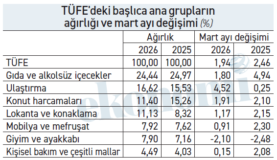 Bu konuda en tipik örnek konut grubu. Bu yıl ağırlığı en çok azaltılan grup olan konut harcamalarında (kira, elektrik, su, doğalgaz) geçen yıl marttaki artış yüzde 2,10’du, bu yılki artış ise yüzde 1,91. Hem bu düşüşün etkisiyle ama daha çok da bu grubun ağırlığının aşağı çekilmesinin etkisiyle toplam TÜFE’ye yansıma geçen yıl martta 0,33 puan düzeyindeyken bu yıl 0,22 puana indi. Konut grubunun ağırlığındaki düşüşün TÜFE’ye asıl etkisi elektrik ve doğalgaza çok yüklü zamlar yapılan bu ay görülecek.