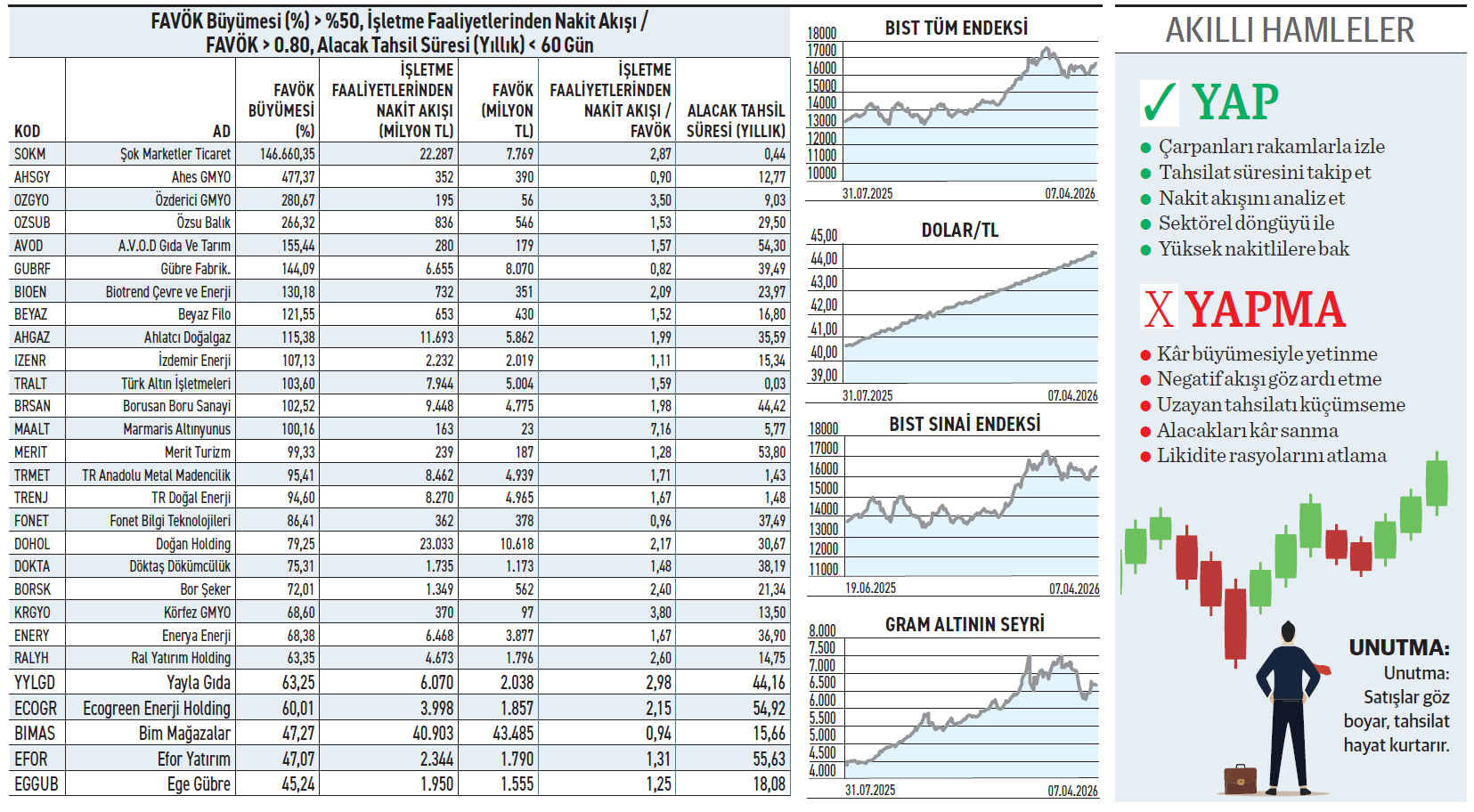 Kâğıt üzerindeki sanal kârlardan önce şirketlerin kasasına giren sıcak paranın neyi işaret ettiği gözlenmeli. Şirketler için dış finansmanın zorlaştığı ve kredi musluklarının daraldığı dönemlerde, dışarıdan borçlanmak yerine doğrudan kendi operasyonundan nakit üretenler zor süreçleri daha rahat atlatma yeteneğine sahip olabiliyor. Belirlediğimiz kriterleri karşılayan Türk Altın ve Şok Marketler alacaklarını anında tahsil etme yeteneğine sahip bulunuyor. Eğer kâr tablosu bir şirketin vitriniyse, nakit akışı ve tahsilat hızı o şirketin can damarıdır. Kârlılık kadar alacağını hızlı tahsil edebilenler ancak piyasanın zor koşullarında ayakta kalabilir.