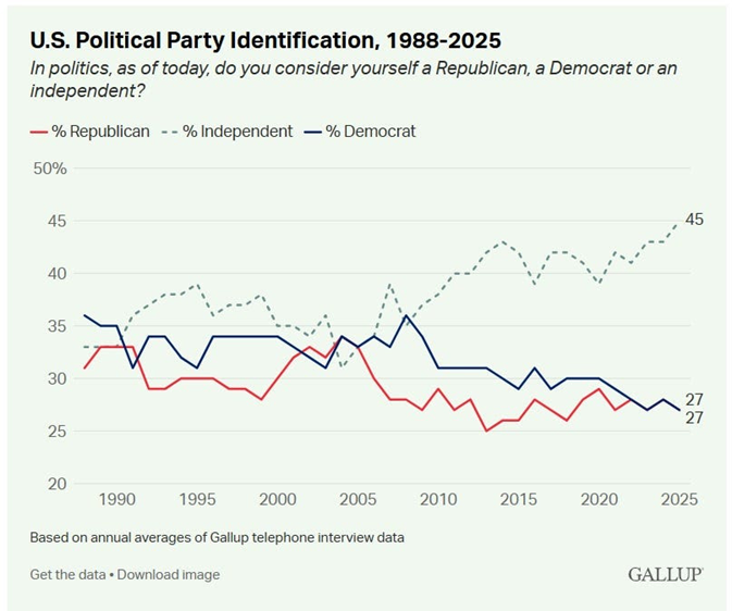 GALLUP ABD’de kendisini iki büyük parti dışında görmek isteyen bağımsızların oranında büyük bir artış gözlemliyor. 1988-2025 arasında ‘bağımsızların’ oranı yüzde 32’den yüzde 45’e yükselmiş durumda. Amerikan seçimlerinin tarihinde partiler arasında pozisyon değiştirme veya üçüncü bir partinin –yani başkan çıkarabilecek veya kongreyi etkileyebilecek kadar güçlü bir odağın- doğabilmesi belki iki kere mümkün görünmüştü. İlki 20. Yüzyılın başında İngiltere’de İşçi Partisi kurulduktan sonradır; diğer ise Vietnam savaşı sırasındaki büyük hoşnutsuzluğun savaş karşıtı bir partiye dönüşmesi olasılığıdır. Şu anda tek bir odak yani tek bir üçüncü parti gerçekçi olmadığı için ara seçimi yine Demokratlar kazanacak gibi görünüyor ancak Demokratların temsil niteliği sınırlı ve aslında Trump’ın görev onayındaki düşüşten tam olarak yararlanamıyorlar. Bunun iki nedeni var: Bir, Amerikan halkı “çekirdek inançlar” veya temel konularda tamamen bölünmüş durumda; ortada adeta iki ulus var. İki, belki yıpranmışlıktan belki de bu ideolojik, hatta çekirdek (vazgeçilemez) değerlere ilişkin büyük ayrımdan dolayı duruşlarını değiştiremiyorlar.
