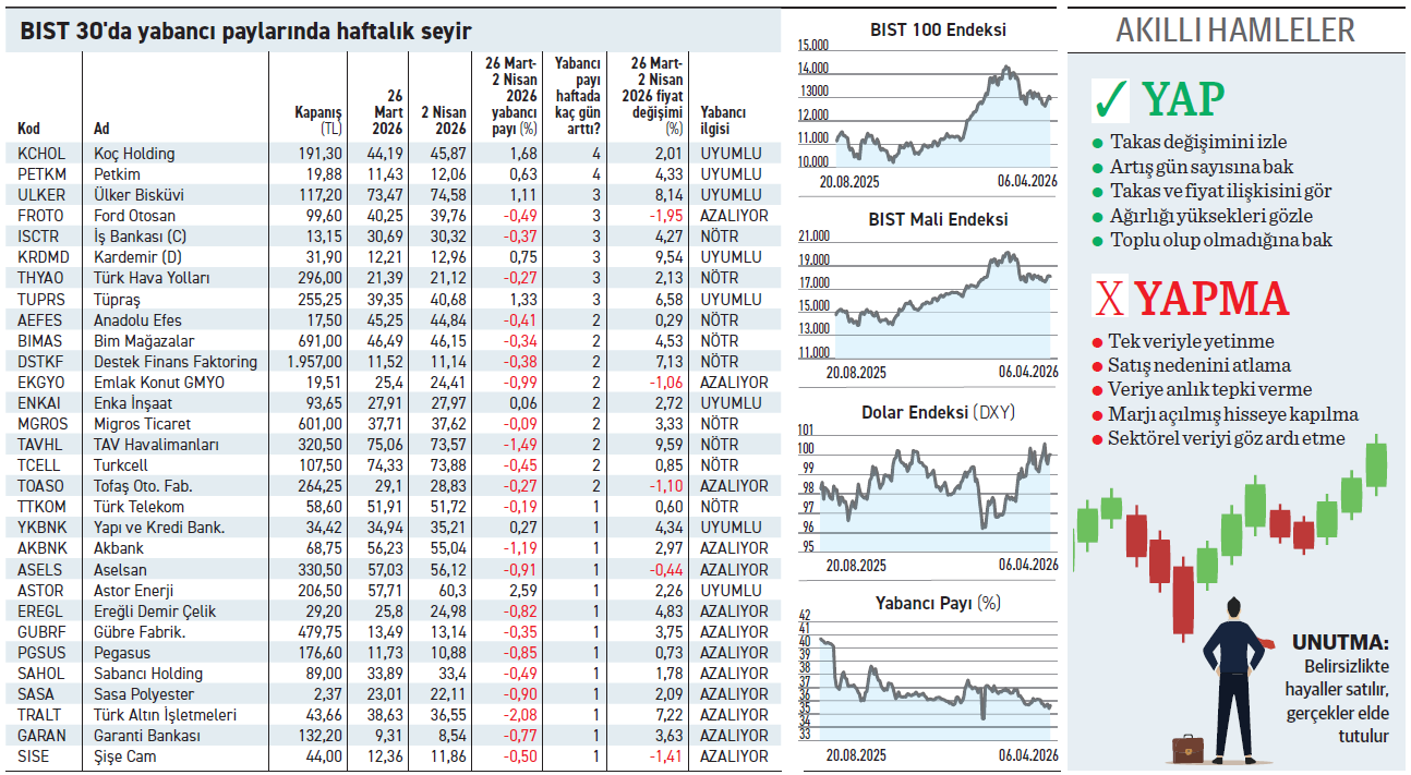 ABD’nin İran’a yönelik derinleşen tehditleri savaşın bölgeye yayılma riskini artırırken dünya ekonomisi bundan payını alıyor. Borsadaki yabancılar ise riskten kaçınmak adına sakin ancak kararlı satışlarını sürdürüyor. 26 Mart- 2 Nisan takas verilerine göre, BIST 30’da satış tarafında oldukları hisse sayısı 22’ye çıktı. Türk Altın’da tek günde yaptıkları 2,08 puanlık satış dikkat çekerken; TAV ve Akbank’ta 1 puanı aşan satışlar geldi. Haftanın sürpriz tarafında Astor Enerji duruyor. Yabancılar paylarını 2,59 puan artırırken adeta gizli bir güvenlikli liman gibi hareket ettiler.