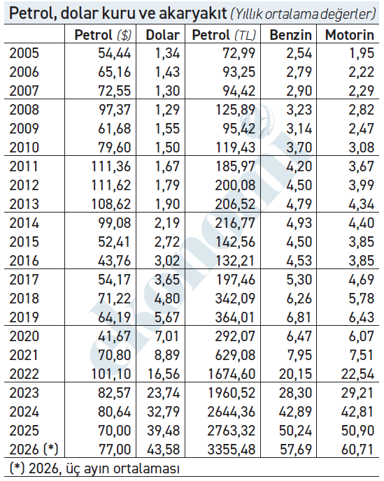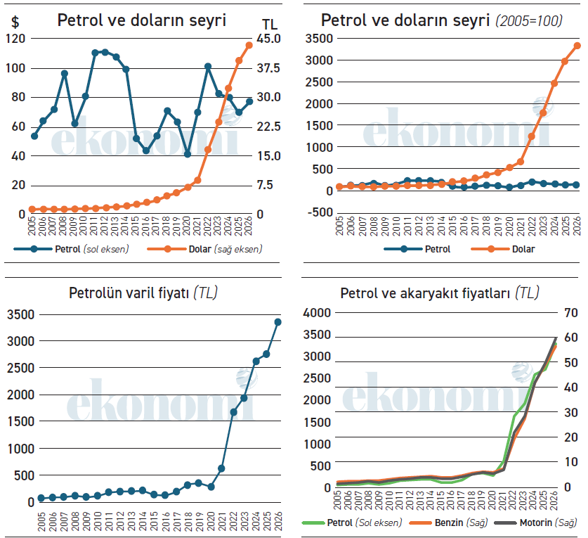 ● Hem de nasıl, tabloyu tekrar inceleyin, grafiklere bakın. Normal gidişat 2021’den sonra nasıl bozulmuş, çok açık biçimde görülüyor zaten. Bakın somut bir örnek vereyim. Ham petrol fiyatı tabii ki Türk parası cinsinden konuşulmaz; ama maliyetin nasıl ve niye arttığına ilişkin somut bir örnek vermek istiyorum. 2018’de petrolün varili 71 dolardı ve Türkiye bu petrolü 4,80’lik dolar kuru üzerinden 342 liraya mal ediyordu. 2025 yılına gelindi, petrolün varili 70 dolar ama bu petrolün TL karşılığı 2.763 lira. Niye, çünkü kur 40 liraya dayandı.