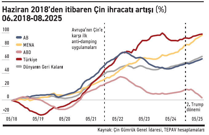 Peki, ne oluyor? Çin’in Avrupa Birliği’ne, Türkiye’ye ve Orta Doğu-Kuzey Afrika ülkelerine olan ihracatı ise aynı tempoda artıyor doğrusu. Amerika’ya satamadıklarını özellikle bizim buralara satıyorlar sanki.