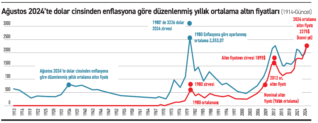 Aşağıdaki grafikte, 2024 yılı ABD dolar kuru baz alınarak altının nominal ve reel fiyat hareketleri gösterilmektedir. Sarı çizgi altının ons bazında nominal, yeşil çizgi ise enflasyondan arındırılmış fiyatlarının yıllık ortalamalarını göstermektedir.