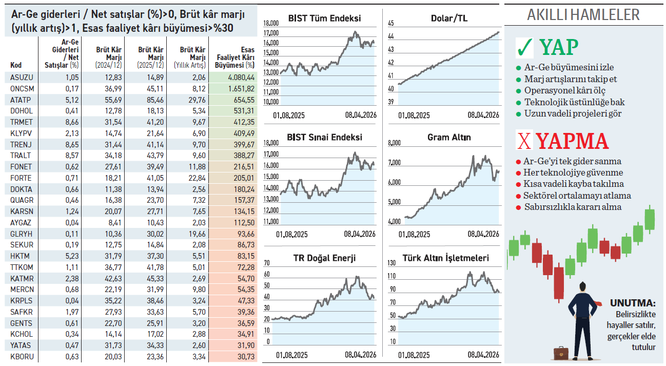 Borsadaki şirketlerin inovasyon yatırımları çarpan etkisi yaratma gücüne sahip olabiliyor. Rekabetin fiyata dayandığı sığ sulardan çıkıp teknolojik derinliğe yatırım yapan şirketler, Ar-Ge bütçelerini kâr makinesine çevirebiliyor. Anadolu Isuzu esas faaliyet kârındaki artışı %4.080’e çıkararak sanayide öne çıkarken, teknoloji tarafında ATP Yazılım %5,12’lik Ar-Ge payıyla faaliyet kâr büyümesini %655 yükseltti. Kimisi fiyat kırarak hayatta kalmaya çalışırken, Ar- Ge’ye bütçe ayıran şirketler, uzun vadeli hedeflerle büyümeyi öne çıkarıyor.