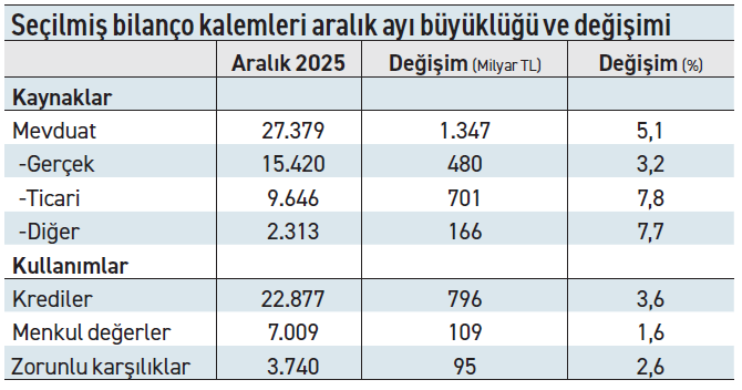 BDDK, haftalık verilerde aralık ayının son haftasını açıkladı. Böylece bankacılık sisteminin aralık ayına ait bilançosu değilse de, önemli bilanço kalemleri ortaya çıktı. Bankacılık sistemi finansal sistemde yaklaşık yüzde 80 pay ile en büyük oyuncu. Dolayısıyla ekonomiyi anlayabilmek için bankacılığın bilanço kalemlerini iyi okuyabilmek önemli.