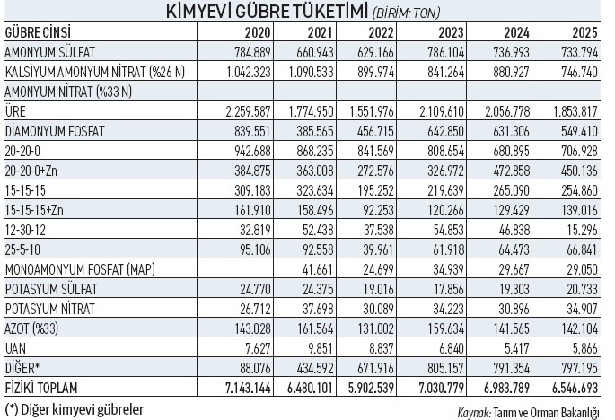 Aynı dönemde, fiziki gübre tüketimi ise 2024 yılına göre yüzde 6 oranında azalarak 6 milyon 546 bin 693 ton olarak gerçekleşti. En çok tüketilen gübre 1 milyon 853 bin 817 ton ile üre gübresi oldu.