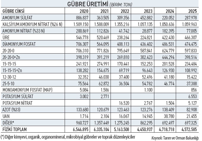 Tarım ve Orman Bakanlığı Tarım Reformu Genel Müdürlüğü “Tarımsal Gübre İstatistikleri - 2025 Bülteni” ne göre, Türkiye’nin 2025 yılı fiziki gübre üretimi 2024 yılına göre yüzde 3 oranında azalarak 4 milyon 572 bin 585 ton oldu. Kalsiyum Amonyum Nitrat(% 26N) gübresi 1 milyon 689 bin 963 ton ile en çok üretilen gübre.