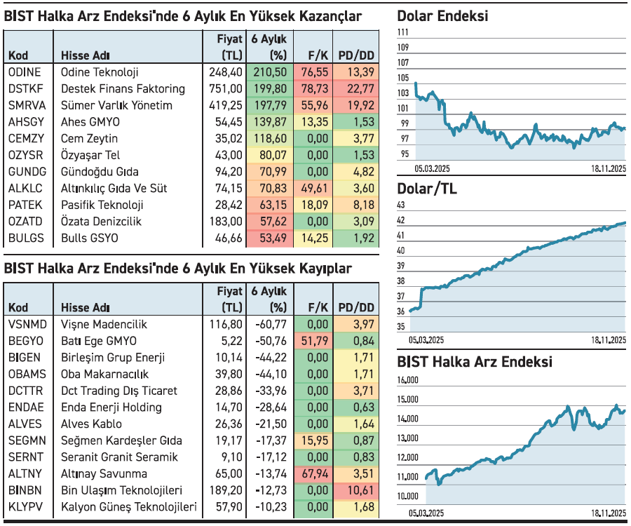 BIST Halka Arz Endeksi son beş yılda gerçekleştirdiği %3.008 gibi yüksek performansıyla dikkat çekiyor. Yeni halka arz olan firmaların yer aldığı endeks, piyasadaki risk iştahının en çabuk yansıdığı alanlardan bir konumunda. Kapsamındaki hisselerde hareketler kısa sürede yüksek ivme kazanabiliyor. Son altı ayda %43,66’lık artış kaydeden endeksteki 59 hissenin 39’u pozitif tarafta yer yer aldı. Yüzde 14’ün üzerinde 11 hisse yükseliş kaydederken birinin çıkışı %210’un üzerinde gerçekleşti. Mart 2024’te borsaya gelen Odine Teknoloji, geride kalan altı ayda %210,5 oranında yükseliş kaydetti. İlk açılışını tavandan 33 TL’den gerçekleştirirken, iki hafta boyunca tavandan işlem gördü. Anılan tarihten bu yana artış ise %653. Dokuz aylık dönemde gelirini %77 artırsa da maliyet ve giderlerden kaynaklı hem esas faaliyetlerden hem de dönem sonunda zararda. Listede ikinci sırada yer alan Destek Finans Faktoring, altı ayda %200’e varan bir artış kaydetti. Geçtiğimiz şubat borsaya geldi. Eylülde 929 TL’yi test ettikten sonra kâr satışlarıyla geriledi ve dalgalı bir seyre döndü. Şubattan bu yana değer artışı %1.354. Son bir ayda TLY fonu güçlü alımlarda dikkat çekti. Aynı sürede hisseyi portföyünde bulunduran fon sayısı 8’den 15’e yükseldi. Şubatta borsaya gelen bir diğer hisse Vişne Madencilik, temmuza kadar güçlü bir yükseliş sergiledi. Fiyat 859,50 TL’yi görmesinin devamında sert bir satışla karşılaştı. Süren satışlarla altı ayda %61 geriledi.