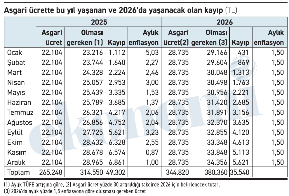 Şu durumda yüzde 30 artışla 28.735 lira olarak belirlenecek asgari ücret daha ilk aydaki yüzde 1,5 enflasyon karşısında bile 431 lira kayba uğrayacak. Yılın tümündeki kayıp da 35.540 lirayı bulacak.