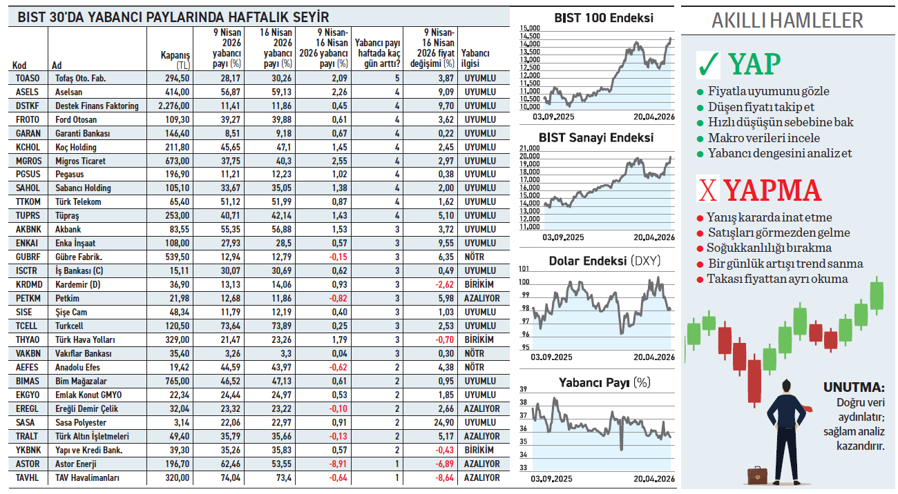 Piyasada kimi yatırımcı sadece toplam yabancı oranına bakar ve ufak bir düşüşü yabancının borsayı terk etmesi olarak okur. Geçtiğimi hafta yabancı payı azalırken Astor hissesindeki yüksek kâr çıkışı etkili oldu. BIST 30 hisselerinde bir önceki hafta satıştan alıma dönen yabancı, 16 hissede payını artırmıştı. Geçtiğimiz hafta alım sürerken sayı 23’e çıktı. Fiyatı düşerken arka kapıdan sessizce toplanan THY ve Kardemir gibi hisselerle, alımların fiyata doğrudan yansıdığı Migros ve Aselsan dikkat çeken hisseler oldu. Yabancılar bir hissede yüksek satış yaparken nakdi 23 hisseye dağıttı.