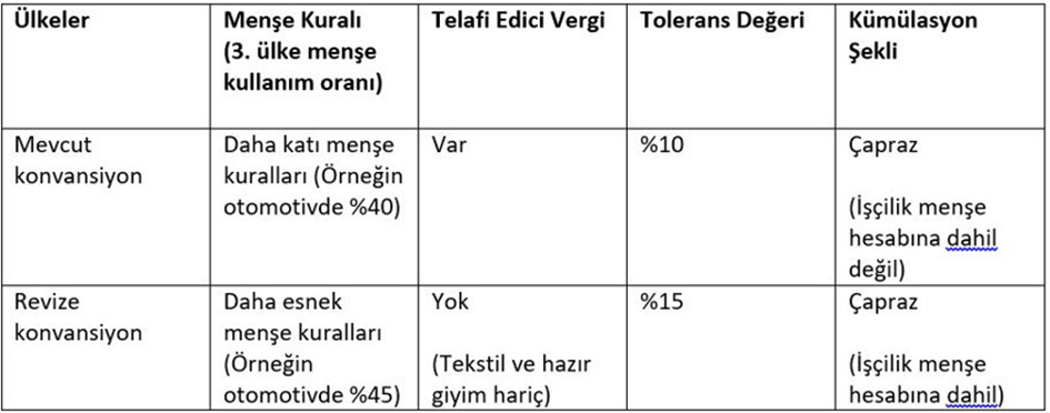 Güncellemede, menşe kazanım kurallarının daha kolay ve esnek bir hale getirilmesi en önemli konu olarak öne çıkıyor. Bu çerçevede, belirlenen menşe kuralları esnetilerek ve konvansiyon içinde olan ülkeler arasında daha az katkı yapılarak menşe kazanımının önü açılıyor. Böylece, kendi içinde daha avantajlı bir ticaret yaratılıyor. Örneğin, 8703’teki binek otomobiller için menşeli olamayan girdi oranı fabrika çıkış fiyatına nazaran %40’tan %45’e çıkıyor. Böylelikle, menşe kazanmak için o ülkede %60 yerine %55 katma değer yaratmak yetiyor. Yine 8528 tarife pozisyonunda yer alan LCD televizyonlar için fabrika çıkış fiyatının %40’ını geçmeyen imalat kuralı %50’ye esnetiliyor ya da ürünün yer aldığı pozisyona ve 8529 dışında diğer pozisyonlardaki girdilerden imalat şeklinde bir kolaylık getiriliyor.