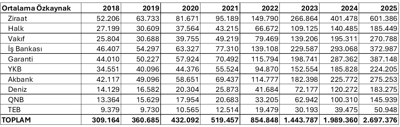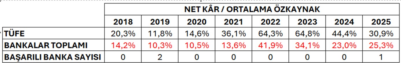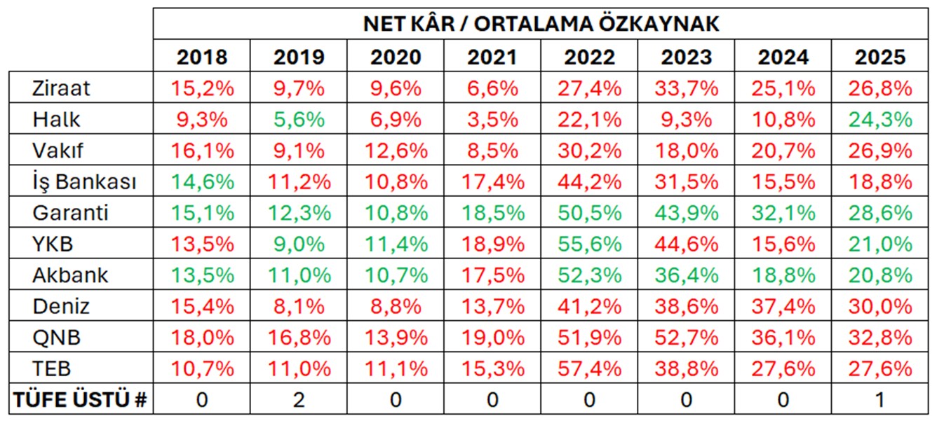 “Net kâr / ortalama özkaynak” oranı ile TÜFE karşılaştırıldığında son derece karamsar bir tablo ortaya çıkıyor. Analizimize konu ettiğimiz on banka sonuçlarının toplamı üzerinden hesaplanan oranlar tüm dönemlerde enflasyonun altında kalmış. Banka bazında bakınca 2019 yılında 2, 2025 yılında da bir olmak üzere, yalnızca üç banka TÜFE’nin üzerinde performans gösterebilmiş. Bu tespitler “banka özkaynakları eriyor” yargısını güçlü biçimde besliyor.
