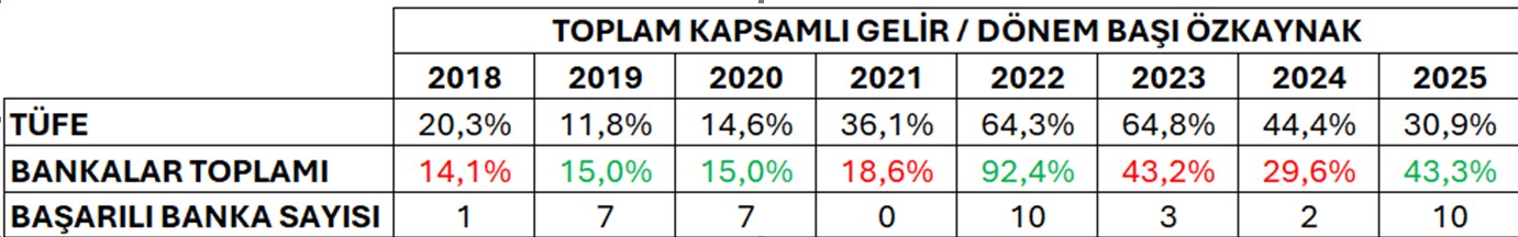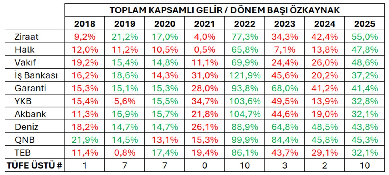 Aynı dönemi “toplam kapsamlı gelir / dönem başı özkaynak” ölçütüyle okuduğumuzda tablo belirgin biçimde değişiyor. Bankalar toplamına baktığımızda sekiz yılın dördünde özkaynaklar enflasyonun üzerinde artırılabilmiş. Banka bazına indiğimizde, 2019 ve 2020 yıllarında çoğu bankanın, 2022 ve 2025 yıllarında ise tüm bankaların TÜFE’nin üzerinde performans gösterdiğini görüyoruz.