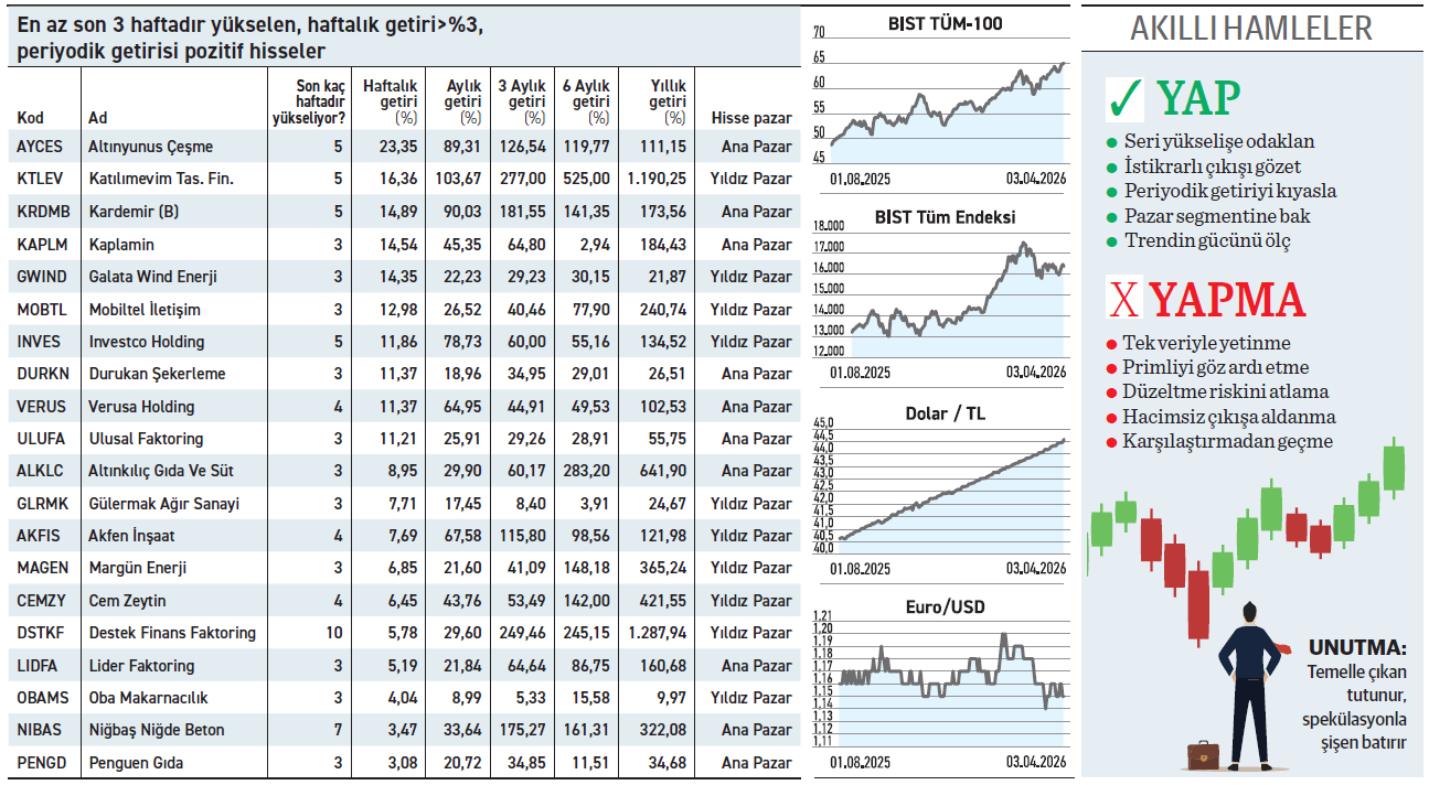 Borsada en az 3 haft adır yükselen, haftalık bazda %3’ün üzerinde kazandıran ve tüm periyodik getirileri pozitif olan 20 hisse bulunuyor. Haftalık %23 ve yıllık %1.280’i aşan getirilerin olduğu bu tablo, hacim arayışındaki borsada paranın disiplinli trendlerde durduğunu söylüyor.