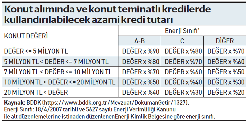 BDDK’nın 29.01.2026 tarihli kararı konut kredilerindeki azami kredi tutarlarını düzenliyor (bkz. aşağıdaki tablo). Aynı Kurul kararında azami kredi tutarının teminat alınan konutun değerine oranına yönelik 24.08.2023 tarihli ve 10656 sayılı Kurul Kararı kapsamında belirlenen hususların, yeni Karar ile belirlenen oranlar üzerinden uygulanmasına devam edilmesine de ayrıca karar veriliyor. Anılan kararda bahsi geçen 24.08.2023 tarih ve 10656 sayılı kararda1 ise; tüketicilere, konut edinmeleri amacıyla kullandırılacak kredilerde ve taşıt kredileri hariç konut teminatlı kredilerde 24.02.2023 tarihli ve 10525 sayılı Kurul Kararında2 belirlenen azami kredi tutarının teminat olarak alınan konutun değerine oranının; tüketicinin kendisinin, eşinin veya 18 yaş altındaki çocuklarının malik olduğu en az bir konutunun bulunması halinde yüzde 75 azaltılarak uygulanmasına karar verilmişti. Yani, 29.01.2026 tarihli BDDK kararında, 2026 düzenlemesinde kredi limitleri ve enerji sınıfı kategorileri güncellenmiş olsa da, 2023 yılında getirilen ve konut sahipliği olanların krediye erişimini zorlaştıran "oranı %75 azaltma" kuralının (halihazırda konutu olanlar için uygulanan kısıtlama) 2026 yılında da geçerliliğini koruduğu görülüyor.