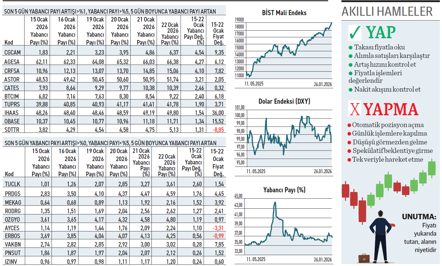 Bir hisse tek gün alınmışsa tesadüftür, 5 gün boyunca her gün %1 alınmışsa bu operasyondur. Yabancılar 15-22 Ocak tarihleri arasında 5 günün beşinde de hiç fire vermeden 3 hissede düzenli alım yaptı.