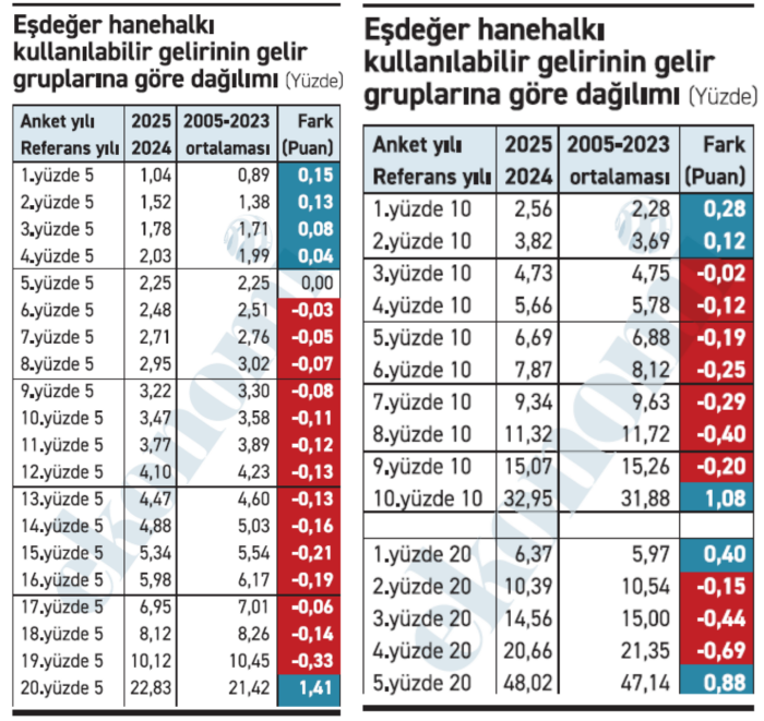 Bu veriler TÜİK’in bu yıl gerçekleştirdiği anket çalışmasıyla belirlenen 2024 yılına ait veriler. Her ne kadar bu çalışma “2025 yılı Gelir Dağılımı İstatistikleri” olarak tanımlanıyorsa da, referans alınan gelirin ve dağılımın 2024 yılına ait olduğunu unutmamak gerekiyor. Bu ayrıntı şu açıdan önemli; 2024 yılındaki gelir dağılımı, bu yıl daha da bozulmuş olabilir, tabii ki tersi de mümkündür. O yüzden dönemi vurgulamak önem taşıyor.