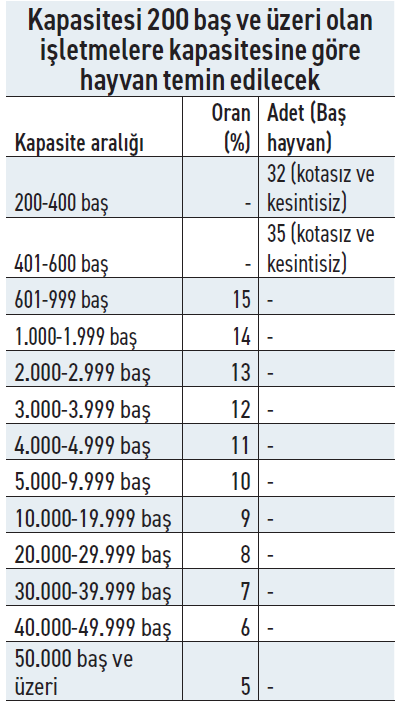 Besilik hayvan ahır kapasitesi 200 baş ve üzeri olan işletmelere ise kapasite büyüklüğüne göre ithal hayvan verilecek. Buna göre, 200 ile 400 baş olan işletmelere kotasız ve kesintisiz 32 baş besilik sığır ithalat izni verilecek. Kapasitesi 401 baş ile 600 baş arası olan işletmelere kesintisiz ve kotasız 35 baş verilecek. Kapasitesi 601 ile 999 baş arası olanlara kapasitesinin yüzde 15’i kadar, 2000 ile 2 bin 999 baş kapasitesi olana yüzde 13, kapasitesi 5 bin ile 9 bin 999 baş olan işletmelere kapasitesinin yüzde 10’u kadar, 50 bin baş ve üzeri kapasitesi olanlara yüzde 5 oranında hayvan ithalat izni verilecek.