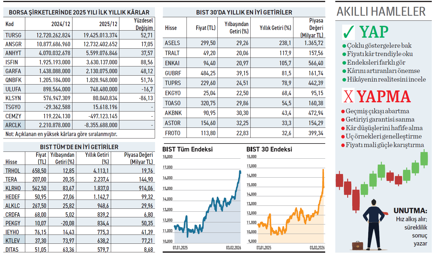 Veriler borsada iki farklı yaklaşımın olduğunu söylüyor. Bir tarafta Aselsan ve Enka İnşaat gibi büyükler; milyarlarca liralık piyasa değerleri ve düzenli bilançolarıyla yatırımcısına korkusuz uyku ve sürdürülebilir kazanç vaat ediyor. Diğer tarafta ise spekülatif rüzgarla stratosfere çıkarak yatırımcıyı büyüleyen hisseler koşuyor. Unutmamak gerekir ki BIST 30 tarafındaki %200’lük kazanç cebe girecek kârken, yan hisselerdeki %4.000’lik yükselişler zamanında inemeyen için ekranda kalan sanal kârdan öteye geçemeyecek hikayelerdir.