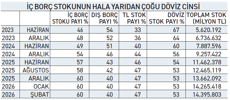 Merkezi Yönetim borç stokunda döviz cinsi borç payında düşüş durdu. Bu yılın ocak ve şubat aylarında payı yüzde 53 olarak gerçekleşti. Geçen yılın ağustos, eylül, ekim, kasım ve aralık aylarından bu yana, 7 aydır düşüş yok. 2023 yılı haziran ayında döviz cinsi borç payı yüzde 67 ile zirve yaptıktan sonra, dezenflasyon programı sonrası mutedil bir düşüş eğilimindeydi. 2023 yılı sonunda yüzde 64’e gerilemişti. 2024 yılına yüzde 64 payla başlamış, düşüşe devam ederek yılı yüzde 56 payla kapatmıştı. 2025 yılını da yine yüzde 55 payla başlamış ağustos ayında yüzde 53’e düşmüştü. Bu tarihten itibaren, son açıklanan 2026 Şubat ayına kadar yüzde 53’e takılı kalmış görünüyor. Merkezi Yönetimin borç stokunda dış borç stoku payı yüzde 40 gözüküyor. Ancak içerden de döviz cinsi borçlanma yapıldığı için, toplam iç + dış döviz cinsi borç payı yüzde 53’e çıkıyor. Bu rakamlara göre 53 puanın 13 puanı içerden döviz borçlanmalardan geliyor. Yeni dönemde içerden dövizle borçlanma durdurulduğu için Haziran 2023’ten beri 12-13 puanlık payında önemli bir değişiklik olmadı. 2025 yılı şubat ayında 14 trilyon 395 milyara ulaşan MY borç stokunun iç – dış, döviz – TL yönünden son kompozisyonu şöyle: