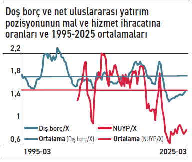 Grafikte 1995’in ilk çeyreği ile 2025’in son çeyreği arasındaki dönemde bu iki oranın nasıl seyrettiği gösteriliyor. Oranın paydasında, her çeyrek için mal ve hizmet ihracatının son bir yıllık toplam değeri yer alıyor. Her iki gösterge de 2025 itibarıyla tarihsel ortalamanın çok altındalar; oldukça olumlu bir durum. Ancak son dönemde gözlenen yükseliş eğilimini karar alıcıların dikkatle izlemeleri gerektiğini de not etmekte yarar var.