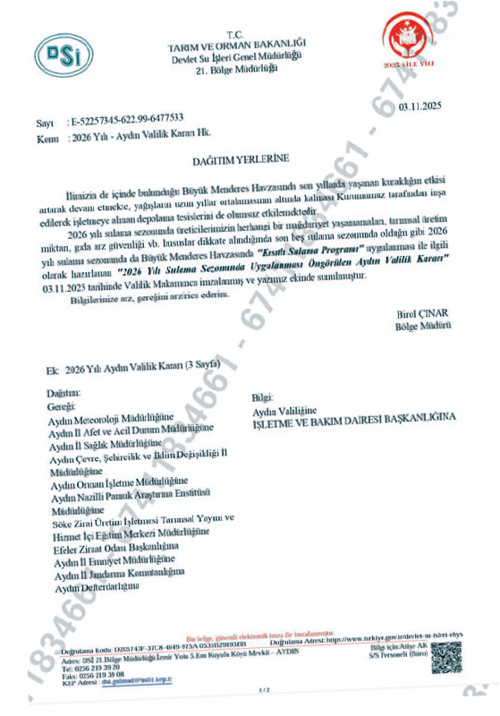 2026 yılı sulama sezonunda üreticilerimizin herhangi bir mağduriyet yaşamamaları, tarımsal üretim miktarı, gıda arz güvenliği vb. hususlar dikkate alındığında son beş sulama sezonunda olduğu gibi 2026 yılı sulama sezonunda da Büyük Menderes Havzasında "Kısıtlı Sulama Programı" uygulanması ile ilgili olarak hazırlanan "2026 Yılı Sulama Sezon unda Uygulanması Öngörülen Aydın Valilik Kararı"03.11.2025 tarihinde Valilik Makamınca imzalanmış ve yazımız ekinde sunulmuştur.”bilgisine yer verildi.
