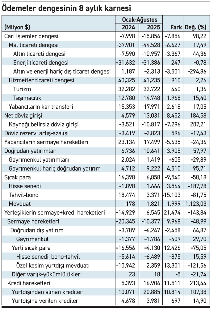 Ancak 2025 yılının 8 aylık sonuçlarına bakarsak cari açığın geçen yıla göre neredeyse ikiye katlandığını görüyoruz. 8 aylık toplam cari açık 7,86 milyar dolar ve yüzde 98,2’lik bir sıçrama ile 15,85 milyar dolara tırmandı.