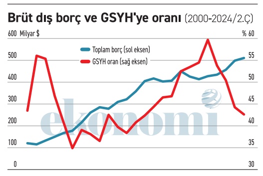 2000 yılında dış borcun GSYH’ye oranı yüzde 43.4 düzeyindeydi. Bu yılın ikinci çeyreğindeki oran ise yüzde 42.6.