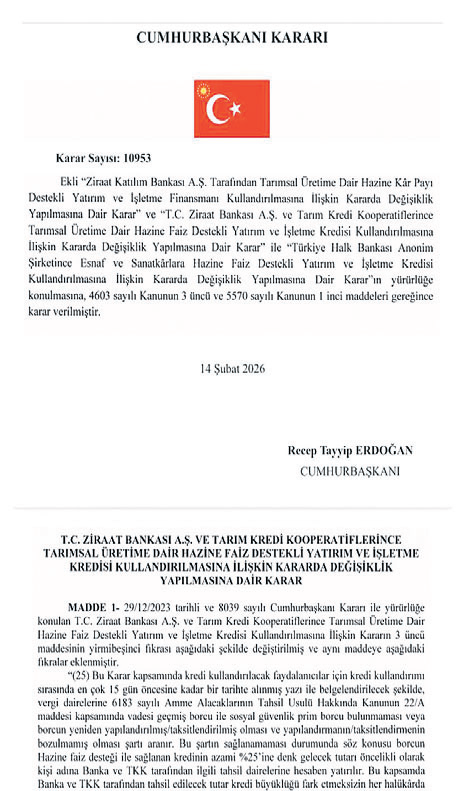 Cumhurbaşkanlığının 24 Ekim 2025 tarihinde Resmi Gazete’de yayımlanan ve 1 Ocak 2026 itibariyle yürürlüğe giren kararı ile çiftçilerin Ziraat Bankası, Ziraat Katılım ve Tarım Kredi Kooperatifleri’nden sübvansiyonlu kredi kullanabilmeleri için “ Sosyal Güvenlik Kurumu prim borcu ve vergi borcunun olmaması” şartı getirildi.