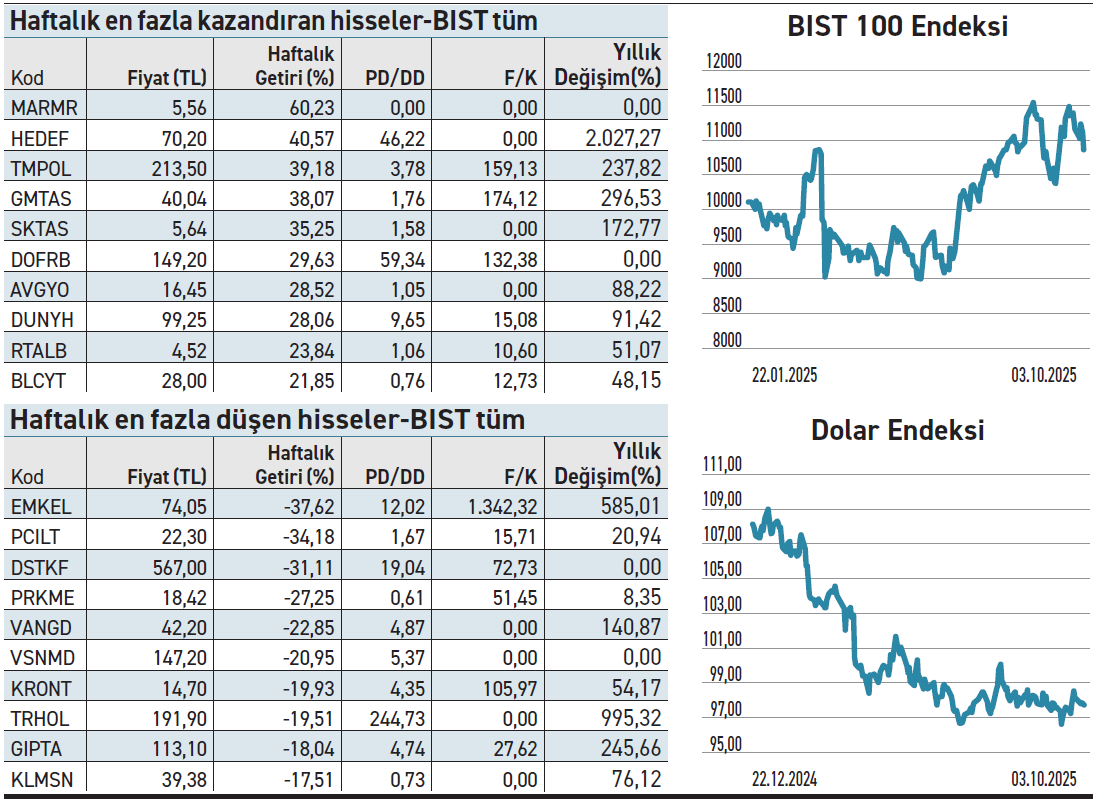 Polisan Holding’in kısmı bölünmesiyle kurulan Marmara Holding, 16 Eylül’den bu yana borsada işlem görüyor. Marmara Holding, üç haftaya yaklaşan süre içinde tavan serileri ile öne çıkıyor. Son bir haftada %60,2 yükseliş kaydederken ilk işlem gününden bu yana değer artışı %270,67 oldu. Haftanın en çok kazandıran ikinci hissesi Hedef Holding, %40,6 yükseliş kaydetti. Son bir yılda %2.027 gibi oldukça yüksek bir çıkış gerçekleştirdi. Şirket performansıyla 136 milyar TL piyasa değerine ulaşırken, listeye giren en yüksek değere sahip firma oldu. Yüksek volatiliteden ötürü 16 Ekim’e kadar hissede brüt takas, kredili alım ve açığa satış tedbiri ile emir paketi tedbirlerini devrede. Son bir haftada %20 ve üzeri altı hisse kaybettirdi. En sert düşüş Emek Elektrik ile PC İletişim’de gözlendi. Her iki hisseye eylülün son haftasından itibaren yoğun satış gelirken sırayla %37,6 ve %34 gerilediler.