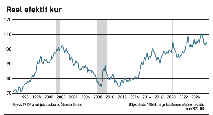 Geçtiğimiz günlerde tahvil getirilerinde görülen yükseliş nedeni ile iflasın eşiğinde olduğu iddia edilen Japonya’nın Yeni ve ordusu, enerjisi, ortak bir hazinesi olmayan Euro ABD dolarına karşı nasıl değer kazanıyor olabilir? Bu sorunun cevabı daha önce paylaştığım makalelerde de adını sık sık geçirdiğim bir kişinden geliyor : “ Küresel ticaret sistemini reforme etme ve Amerikan sanayisini dünyanın geri kalanına karşı daha adil bir zemine oturtma arzusu, Başkan Trump için on yıllardır tutarlı bir tema olmuştur. Uluslararası ticaret ve finans sistemlerinde nesiller arası bir değişimin eşiğinde olabiliriz. Ekonomik dengesizliklerin kökeni, uluslararası ticaretin dengelenmesini engelleyen sürekli dolar aşırı değerlenmesinde yatmaktadır (ek olarak eer grafiğini ekledim) ve bu aşırı değerlenme, rezerv varlıklarına yönelik esnek olmayan talepten kaynaklanmaktadır. Küresel GSYİH büyüdükçe, imalat ve ticarete konu sektörler maliyetlerin yükünü taşıdığı için, Amerika Birleşik Devletleri'nin rezerv varlıklarının ve savunma şemsiyesinin finansmanını sağlaması giderek daha zor hale gelmektedir.” Bu satırların yazarı şu anda Fed Yönetim Kurulu Üyesi olan Stephen Miran. Bir resim bin sözcüğe bedeldir diyerek yukarıdaki paragrafı bir grafiğe çevirdiğimizde ise karşımıza şu tablo çıkıyor.