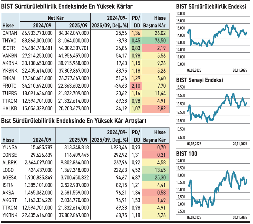 BIST Sürdürülebilirlik Endeksi, çevresel ve yönetişim uygulamalarını önemseyen firmaları kapsıyor. Çevresel etkilere duyarlı yatırımcıların yakından takip ettiği referans niteliğine sahip. Endeksteki hareketler, kârlılık kadar uzun vadeli kurumsal dayanıklılığı da okumaya imkân veriyor. Dokuz aylık mali sonuçlarda kapsamındaki 95 şirketten dördünün net kârı %220’nin üzerinde büyüdü. Bunlardan birinin artış oranı %1.923’e ulaşırken, en yüksek net kâr 84 milyar TL ile bankacılık sektöründen geldi.