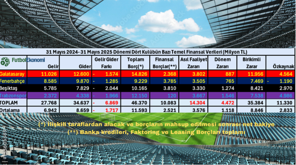 Dört kulübün dönem sonu zararları ise 31.05.2025 itibariyle 4.5 Milyar TL’ye yaklaştı.