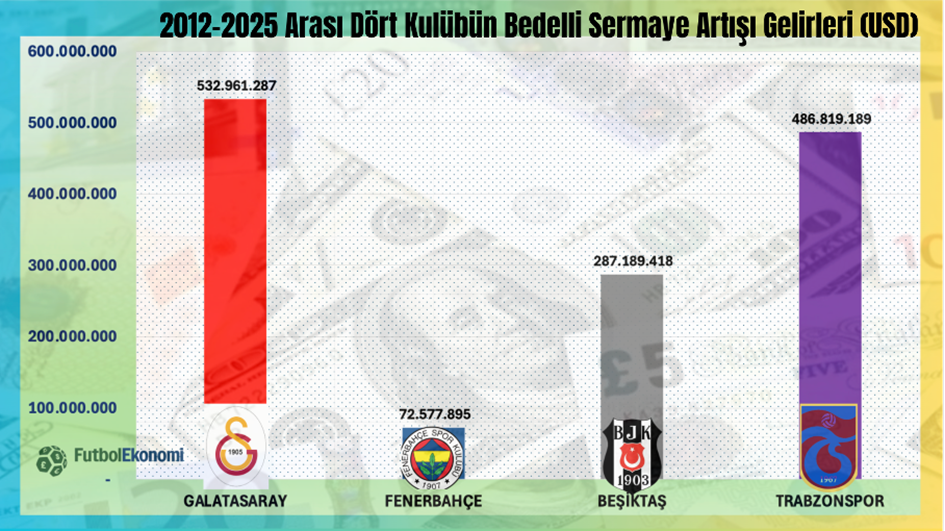 2020-25 arası dört kulübün toplam bedelli sermaye artışı gelirleri 845.492.515 USD olarak gerçekleşti. Bu da 2012-2025 arası gerçekleştirilen toplam 1.380 Milyon USD’lik bedelli sermaye artırımlarının % 61,28’ine karşılık geliyor.