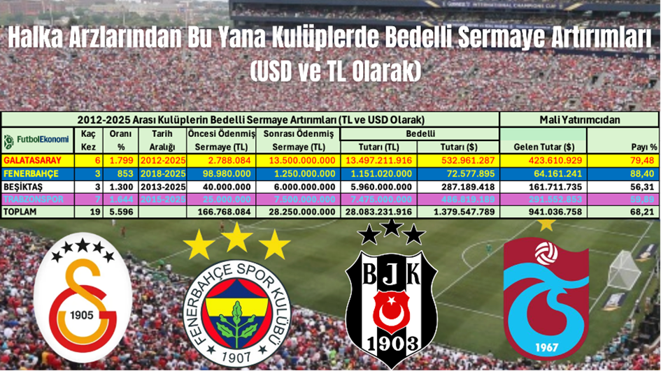 Yukarıdaki tutarları USD olarak ortaya koyarsak; kulüpler 2012-2025 arası bedelli sermaye artırımlarından gelen toplam 1.379.547.789 USD’nin % 68,21’i olan 941.036.758 USD’lik kısmı mali yatırımcıdan tahsil ederken, 438.511.031 USD’lik (%31,79) bölümünü de kendi kaynaklarından karşıladılar.