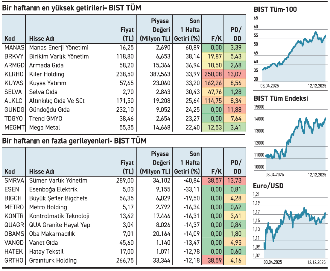 BIST Tüm Endeksi geçtiğimiz hafta %2,93 yükselişle bir önceki haftanın ivmesini güçlendirirken talep gören hisselerin sayısı arttı. Toplam 328 hissenin artıda kapattığı haftada, 6 hisse %30’un üzerinde prim yaptı. Listenin en tepesindekinin %61’e ulaşan performansı dikkat çekti. Bu sürede 214 hissenin gerilemesi ve en fazla düşenin kaybının %41’e yaklaşması haftanın temel ayrışması oldu. Manas Enerji geçtiğimiz hafta gerçekleştirdiği %61’lik artışla öne çıktı. Son işlem gününde bir ara tavanı bozulsa da beş gün boyunca tavandan işlem gördü. 2 Aralık günü başlayan yukarı yönelim, geçtiğimiz hafta ivme yükseltti. Yüzde 200 bedelli sermaye artırımı için SPK’dan onay bekleyen firmayla alakalı yakın tarihli önemli bir açıklama bulunmuyor. Birikim Varlık %38 ile en fazla yükselen ikinci hisse konumunda. Mart 2024’te en yüksek 239,37 TL’ye kadar çıkarken, sonrasında hızla geriledi. Ekim 2024’ten itibaren ise tekrar kademeli bir yükseliş trendine girdi. Geçtiğimiz hafta gerçekleştirdiği yüksek performansa rağmen zirvesinin hayli gerisinde duruyor. Dokuz aylık dönemde faiz gelirini artırsa da net kârını %13 düşürdü.
